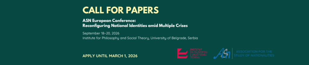 The University of Belgrade – Institute for Philosophy and Social Theory (IFDT), in cooperation with the Association for the Study of Nationalities (ASN), invites proposals for the conference “Reconfiguring National Identities amid Multiple Crises” to be held 18–20 September 2026 in Belgrade, Serbia.The ASN European Conference welcomes individual papers and panel proposals, as well as roundtables and book panels, on ethnicity, ethnic conflict, nationalism, national identity, and related topics, with a regional focus on Central, Eastern, and Southeastern Europe, Russia, Ukraine, the Caucasus, and Eurasia.As an interdisciplinary event, the conference welcomes contributions from anthropology, cultural studies, economics, geography, history, law, literature, political science, gender studies, psychology, sociology, and related fields, as well as interdisciplinary and multidisciplinary studies employing diverse methodologies.We particularly encourage proposals engaging with one or more of the following conference themes:1. Contesting national narratives in Southeastern Europe and beyond2. Wars and the transformation of European national identities3. The future of populism and responses to democratic, economic, and climate crises